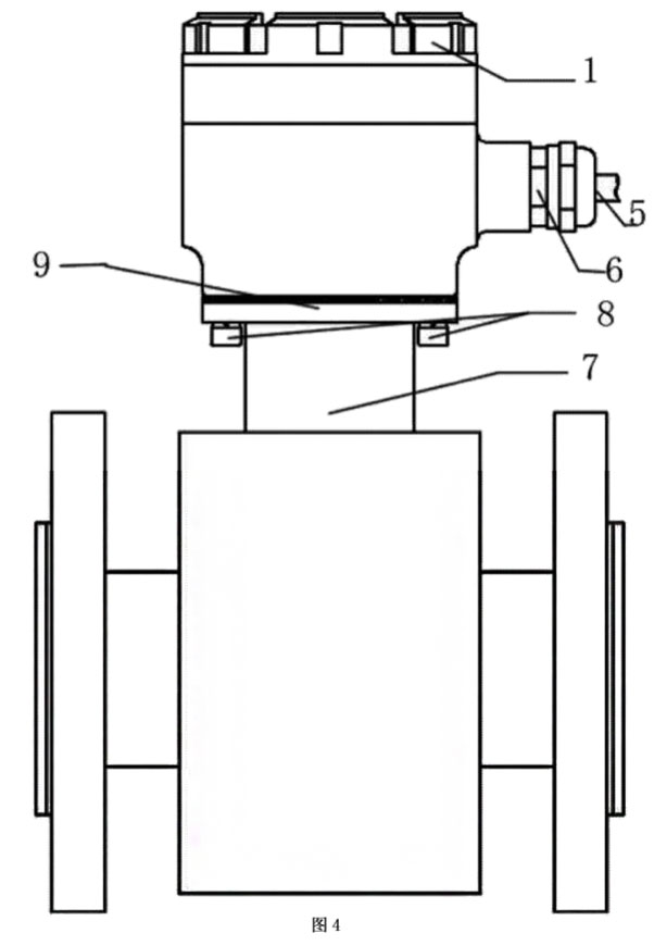 本實(shí)施例如圖4所示,分體接線盒用4只M6的螺釘8將殼體3與固定在流量傳感器7上端,売體3與傳感器7之間采用橡膠密封墊9密封。端子排7用兩個(gè)M4的螺釘固定在殼體內(nèi),接線端子通過連接電纜5,穿過安裝在売體上的格蘭頭6連接到變送器。分體蓋1通過螺紋擰緊在殼體3的上端,分體蓋1與殼體3的密封采用0型圏密封。使用時(shí)電纜與管道軸線方向一致,管道為垂直方向時(shí),電纜出線方向朝下,從而不會(huì)造成外部的液體流入殼內(nèi)。