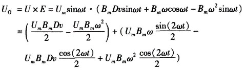 式(7)中,( BmDvsinωt)項為水流切割管內(nèi)磁感線產(chǎn)生的電動勢;磁場強(qiáng)度Bm、管內(nèi)直徑D和ω都是已知量;v為要求的水流速度;[2πf Bmcosωt-(2πf)²•Bm sinωt]項為干擾電動勢。由于信號構(gòu)成存在差異,所以去除干擾信號的方法有很多種。例如:干擾信號與流量信號存在90°的相位差,可以用相敏檢波的方法去除干擾信號;干擾信號與流量信號頻率不同時可以用帶通濾波、帶阻濾波、高通濾波和低通濾波的方法。從式(7)中可以看出:流量計的干擾信號與流量信號都是交流信號,頻率相同但相位差不同。上面提到的方法不能完全去除此流量計的干擾,所以筆者采用如下方法,將流量計電極間信號E與勵磁電壓信號U相乘處理,得到電壓U0如下式: