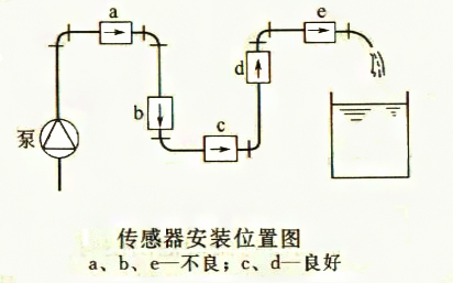 傳感器安裝方向水平、垂直或傾斜均可,不受限制。但測量固液兩相流體*好垂直安裝,自下而上流動。這樣能避免水平安裝時襯里下半部局部磨損嚴(yán)重,低流速時固相沉淀等缺點。 水平安裝時要使電極軸線平行于地平線,不要處于垂直于地平線,因為處于地步的電極易被沉積物覆蓋,頂部電極易被液體中偶存氣泡擦過遮住電極表面,使輸出信號波動。圖所示管系中c、d為適宜位置a、b 、e為不宜位置,b處可能液體不充滿a、e處易積聚氣體,且e處傳感器后管段短也有可能不充滿,排放口*好如f形狀所示。對于固液兩相流c處亦是不宜位置。