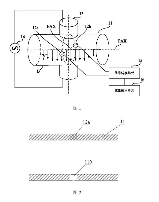 圖1顯示了現(xiàn)有技術(shù)中的一種電磁流量計(jì)的結(jié)構(gòu)。如圖1所示,所述電磁流量計(jì)包括:流動(dòng)有被測流體的測量管11,和與被測流體相接觸且對向配置在測量管11上的電極12a、12b,向被測流體施加磁場的勵(lì)磁線圈13,向勵(lì)磁線圈13供給勵(lì)磁電流、使其產(chǎn)生磁場的電源單元14。另外,所述電磁流量計(jì)還包括:與電極12a、12b連接用于檢測電極12a、l2b之間的感應(yīng)電動(dòng)勢的信號轉(zhuǎn)換單元15,從由信號轉(zhuǎn)換單元15檢測出的電極間電動(dòng)勢計(jì)算出被測流體的流量的流量輸出單元16應(yīng)用所述電磁流量計(jì),當(dāng)流體在測量管11中穿過由勵(lì)磁線圈13產(chǎn)生的磁場流動(dòng)時(shí),根據(jù)法拉第定律,就會在電極12a、12b上產(chǎn)生感應(yīng)電動(dòng)勢,流體的平均流速與電極處感應(yīng)出的電壓之間具有線性關(guān)系,這一關(guān)系可以用下述公式表示:E=K*B*舉V,其中E為所產(chǎn)生的感應(yīng)電壓,K為比例常數(shù),B為磁場強(qiáng)度,D為導(dǎo)管直徑,而V為傳導(dǎo)型流體的平均流速這樣,利用信號轉(zhuǎn)換單元15和流量輸出單元16,即可測得與所述感應(yīng)電動(dòng)勢對應(yīng)的流體的流速,進(jìn)而獲得流體的流量陶瓷管電磁流量計(jì)傳感器有很多優(yōu)點(diǎn),但電極密封是一個(gè)很大難題。圖2為圖1中沿著與勵(lì)磁線圈13產(chǎn)生的磁場相垂直的平面用以顯示電極布置的剖示圖。如圖2,測量管11設(shè)有電極插孔110,所述電極插孔110為圓柱形或圓錐形,其厚度大致與測量管11的壁厚相當(dāng),電極(在這里僅標(biāo)示出電極12a)內(nèi)嵌于測量管11的電極插孔110中。然而,圖2所示中的電極,只有少數(shù)廠家具備特殊的燒結(jié)技術(shù),在高溫高壓環(huán)境下制作出電極以確保電極不滲漏,實(shí)現(xiàn)難度極大。而采用0型圈等機(jī)械裝配密封,由于陶瓷材料表面一定厚度會變湖,使用時(shí)間一長,絕緣性就會下降,影響測量精度