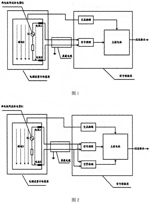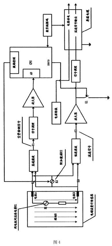 圖1是一種原有電磁流量計的電路結構示意圖圖2是一種原有帶空管檢測的電磁流量計的電路結構示意圖圖3是一個電極與地之間施加空管檢測信號的電磁流量計的電路結構示意圖圖4是兩個電極之間施加空管檢測信號的電磁流量計的電路結構示意圖五、具體實施方式見圖1示意圖中,電磁流量計傳感器在交流勵磁下,產生交變磁場,導電流體在交變磁場中切割磁力線產生感應電勢E1,通過屏蔽電纜輸出至遠端信號轉換器的主控制電路板,在主控制電路板上輸出流速信號并顯示見圖3、圖A示意圖中,由CPU控制口產生周期為16us的高頻激勵,經模擬轉換為高頻正弦激勵E2,該i正弦激勵直接施加在,電磁流量計傳感器的其中一個電極與地或者是兩個電極之間,(圖3是一個電極與地之間施加空管檢測信號的電磁流量計的電路結構圖,圖4是兩個電極之間施加空管檢測信號的電磁流量計的電路結構圖):由此產生被測流體內阻R1的測量信號U1,該測量信號U1與流體內阻R1成線性關系U1=K*R1(K為已知系數),不可避免的是流體內阻測量信號與流體流速測量信號同時存在,二者混在一起,再經過高通濾波電路將空管檢測信號提取出來,此時對流速信號衰減在604B以上,經CP實時采樣并經過數字濾波后,與設定的閱值(可調參數)相比較,若判斷為空管,則v發(fā)出zcro信號,立刻閉合開關K1關閉流速測量信號,使信號轉換器顯示為零,否則斷開開關K正常輸出流速信號。而電極上流速測量信號經過低通濾波電路,此時對空管檢測信號衰減60u8以上,再經過信號調理電路后輸出流速信號,實現與空管檢測信號相互分離,從而保證流速測量的準確度008]見圖2示意圖中,是一種原有的帶空管檢測的電磁流量計的電路結構圖,由于電纜分布電容的影響,該分布電容對高頻率的空管檢測信號有一定的損耗,特別是長距離的屏蔽電纜,會直接影響到空管檢測信號對于流體電導率的測試,所以該結構并不適合,本實用新型提出的高頻率信號空管檢測方式。結合圖3和圖4可以看出為了保證微弱的空管檢測信號不失真的傳輸,空管檢測裝置就近放置于傳感器出線處(傳感器內部),進行信號處理后再通過屏蔽電纜傳輸,從而解決了高頻率空管檢測信號對電纜分布電容大小的要求009由于電磁流量計傳感器與信號傳換器之間通常只有用于傳輸流速信號的二芯屏數電纜,并沒有低壓直流電源供給電纜,為了滿足通用的安裝習慣,不對空管檢測裝置另外增加供電電纜,空管檢測裝置的供電電源使用二芯屏蔽電纜的其中一根導線進行供電,另外一根導線用于傳輸經過調理后的流速信號;實現直流供電與信號傳輸共用一根二芯屏蔽電纜0020根據不同的使用環(huán)境,信號傳換器需要調整空管檢測裝置的空管閱值參數設置時,則使用數字信號調制方式,該信號疊加在供電電源的電纜上進行傳輸,方便在現場調整空管檢測裝置的參數,滿足不同的使用條件。由于數字編解碼是已知的技術,所以在這里不詳細進行說明