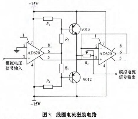 感應(yīng)電壓檢測(cè)模塊主要由勵(lì)磁電路和弧狀電極傳感器組成,其中勵(lì)磁電路用來(lái)在流體測(cè)量區(qū)域產(chǎn)生盡量均勻的磁場(chǎng)分布,而內(nèi)嵌在管道內(nèi)壁與流體接觸的弧狀電極傳感器則負(fù)責(zé)拾取帶有流體速度參數(shù)的感應(yīng)電壓信號(hào)。為在流體測(cè)量區(qū)域產(chǎn)生盡可能均勻的磁場(chǎng),勵(lì)磁線圈采用馬鞍形線圈。在勵(lì)磁系統(tǒng)設(shè)計(jì)中,鐵芯可以提供磁通路徑,從而改變磁場(chǎng)分布,并加強(qiáng)磁感應(yīng)強(qiáng)度。同時(shí),為降低鐵芯渦流損耗以及增加磁路導(dǎo)磁系數(shù),鐵芯采用表面涂有絕緣漆的薄硅鋼片疊加而成。在鐵芯上套上馬鞍形線圈即組成勵(lì)磁系統(tǒng)。直流勵(lì)磁使得弧狀電極拾取的感應(yīng)電壓中存在極化電壓信號(hào),而交流勵(lì)磁則會(huì)引起的正交干擾和同相干擾。因此,為克服直流勵(lì)磁和交流勵(lì)磁存在的缺點(diǎn),設(shè)計(jì)采用在線圈中施加頻率∫=6.25Hz的低頻矩形波勵(lì)磁方式。勵(lì)磁電路主要包括AD620和AD71組成的壓控電流源電路和三極管9013和9012組成的互補(bǔ)對(duì)稱(chēng)推挽型功率放大電路,如圖3所示,模擬電壓信號(hào)由PXI模塊的模擬信號(hào)輸出端給出。