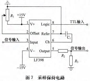 采樣保持電路實(shí)際是一種模擬信號(hào)存儲(chǔ)器,其開(kāi)關(guān)通斷通過(guò)數(shù)字指令控制,從而完成輸入信號(hào)瞬時(shí)值的采樣及存儲(chǔ)。圖7所示為集成芯片LF398組成的采樣保持電路,該電路具有采樣速度快、保持下降速度慢、抗干擾能力強(qiáng)和不易受溫度影響等特點(diǎn),其邏輯電平輸人與TI相連。當(dāng)TTL為高電平時(shí),對(duì)輸入信號(hào)進(jìn)行采樣;當(dāng)TIL為低電平時(shí),對(duì)輸入信號(hào)進(jìn)行保持。