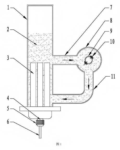 圖1為本發(fā)明電磁流量計的脫蠟裝置結(jié)構(gòu)示意圖;圖中序號說明:1箱體、2導熱介質(zhì)、3PTC陶瓷加熱器、4防爆接線座、5鎖緊帽、6電纜、7*介質(zhì)通道、8吸熱器、9測量導管、10電極、11第二介質(zhì)通道。