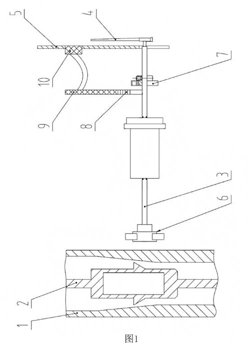 參見圖1、圖2,一種金屬轉(zhuǎn)子流量計(jì)的組合結(jié)構(gòu),包括測量系統(tǒng)和位移傳感裝置,測量系統(tǒng)包括錐管1和位于錐管1中的磁性浮子2,位移傳感裝置包括指針組件、刻度盤5和轉(zhuǎn)換器,其中,指針組件包括轉(zhuǎn)動軸3、感應(yīng)磁鋼6和指針4,感應(yīng)磁鋼6固定在轉(zhuǎn)動軸3的一端,該感應(yīng)磁鋼6靠近所述磁性浮子2,且感應(yīng)磁鋼6的磁場方向與磁性浮子2的磁場方向相反,指針4固定在轉(zhuǎn)動軸3的另一端,其中,磁性浮子2的上端為N極,磁性浮子2的下端為S極,感應(yīng)磁鋼6的上端為S極,感應(yīng)磁鋼6的下端為N極。轉(zhuǎn)換器包括角位移磁鋼7、線性角位移傳感器8、集成電路板9和液晶顯示器10,液晶顯示器10固定安裝在刻度盤5上,角位移磁鋼7呈圓環(huán)狀,角位移磁鋼7固定在轉(zhuǎn)動軸3上,線性角位移傳感器8固定在集成電路板9上,線性角位移傳感器8靠近角位移磁鋼7,集成電路板9與液晶顯示器10之間通過數(shù)據(jù)線連接。
