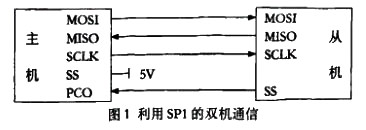 SPI使用3根線進(jìn)行通信:數(shù)據(jù)入、數(shù)據(jù)出和串行時鐘。包含4個引腳:MISO主機(jī)輸入從機(jī)輸出腳MOSI主機(jī)輸入從機(jī)輸出腳、SCLK時鐘腳及SS腳。單片機(jī)設(shè)置為主機(jī)方式時,SCLK信號由內(nèi)部CPU總線時鐘給出。單片機(jī)為從機(jī)方式時,在允許SPI系統(tǒng)后,SS為輸入腳,它用于允許SPI從機(jī)發(fā)送數(shù)據(jù),相當(dāng)于從機(jī)的片選信號。圖1為利用SPI進(jìn)行雙機(jī)通信的示意圖。