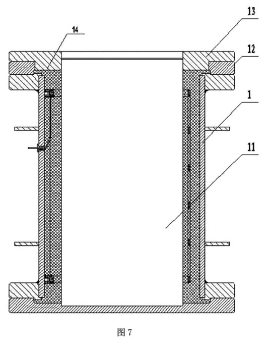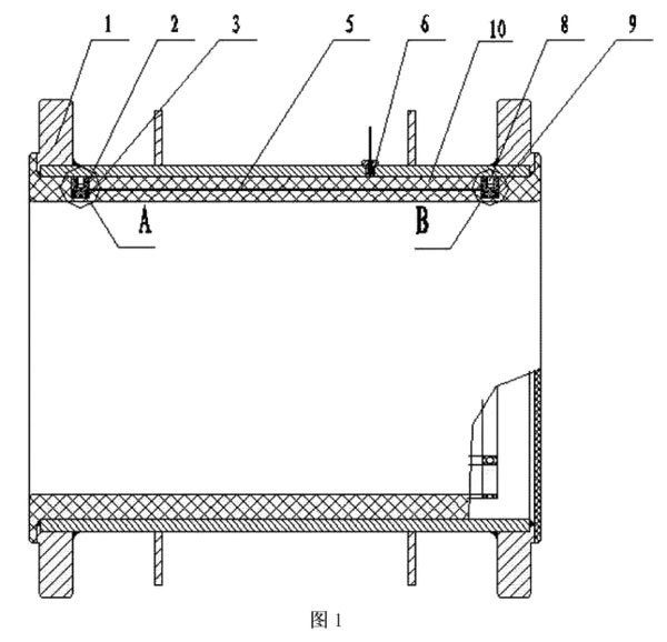 ⑦、將倒入聚氨酯樹脂膠10的電磁流量計導(dǎo)管1放入110℃的硫化罐中進行硫化,10小時后,撤掉襯膠模具11繼續(xù)硫化24小時后完成襯膠。