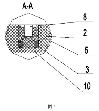 壁固定在一起,耐高溫導(dǎo)線7的一端與焊片9連接,耐高溫導(dǎo)線7的另一端穿過電磁流量計導(dǎo)管1上設(shè)有的絕緣線螺栓6與接線盒內(nèi)設(shè)有的報警電路連接,在電磁流量計導(dǎo)管1的內(nèi)壁上設(shè)有一層樹脂膠10,傳感器封裝在樹脂膠10內(nèi)。