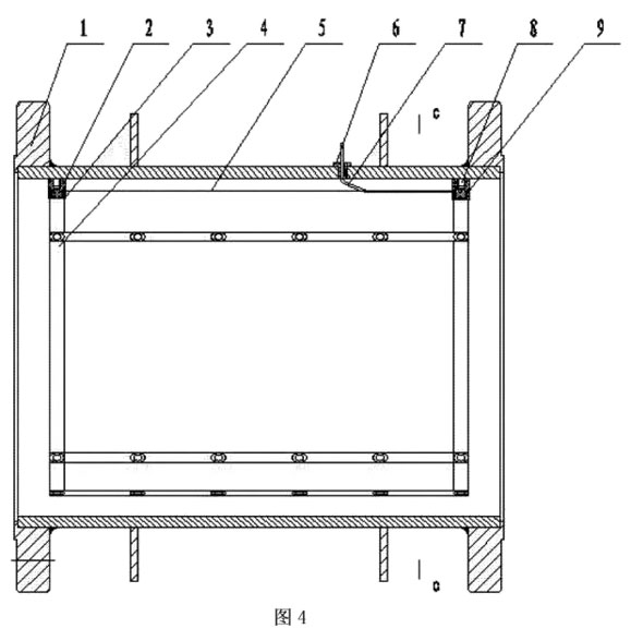 ③、將兩個環(huán)狀內(nèi)襯筋板4通過其筋板上開有的數(shù)個通孔分別放到電磁流量計導(dǎo)管1內(nèi)壁兩端固定的一圏數(shù)個絕緣支柱2上,將數(shù)個連接板5通過其條板上開有的數(shù)個通孔軸向放置在電磁流量計導(dǎo)管1內(nèi)壁內(nèi)固定的數(shù)個絕緣支柱2上,數(shù)個連接板5兩端與兩個環(huán)狀內(nèi)襯筋板4搭接在一起,同時在靠近電磁流量計導(dǎo)管1上固定的出線螺栓6一端的內(nèi)襯筋板4和連接板5搭接處之間,放置一個焊有耐高溫導(dǎo)線7的焊片9;