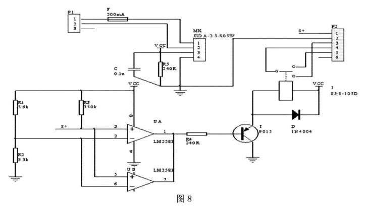 傳感器是用80.5mm厚304不銹鋼板制成的網(wǎng)狀傳感器。報警電路是由比較器、繼電器組成,采用繼電器輸出。耐高溫導(dǎo)線為AF-200聚全氟乙丙烯絕緣電纜。