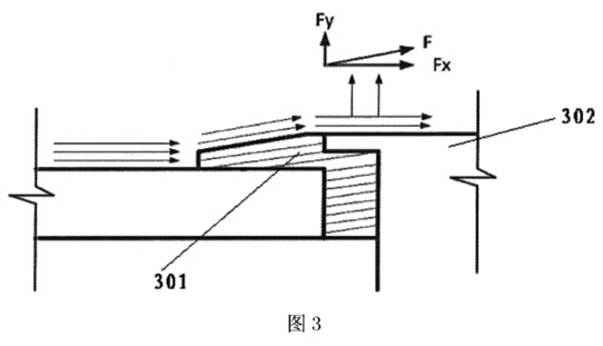 通過液體介質(zhì)流過由保護(hù)套301形成的坡面進(jìn)行導(dǎo)流,可以產(chǎn)生一個(gè)與坡面平行的力F,這個(gè)力可以分解為水平方向的力Fx和垂直方向的力Fy,與液體介質(zhì)的流向垂直的力Fy可以減少電極頭302表面所承受的壓力,從而減少電極頭的磨損。坡面的傾斜角越大,垂直向上的力Fy也越大。但是,應(yīng)該注意,坡面的傾斜角不能設(shè)置的過大,以免產(chǎn)生擾流,即,坡面的傾斜角的設(shè)置不要對液體介質(zhì)的流速產(chǎn)生影響。通常,為了確保坡面的傾斜角度,保護(hù)套的頂部不高于電極頭的頂部。