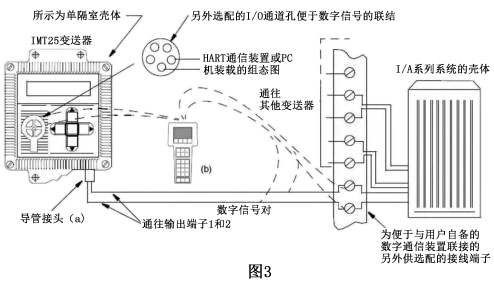 導(dǎo)管走向向下避免水分積聚在接線盒中。任何不用的導(dǎo)管開口都應(yīng)加以悶塞。HART通信裝置或裝載在PC機(jī)上的組態(tài)器可以連接在變送器現(xiàn)場接線端到外部負(fù)載之間的任何位置,或連接到另外配供的IO孔口上。如圖3所示;