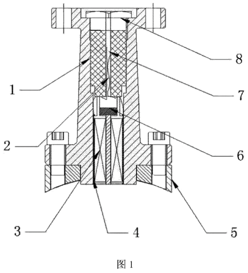 如圖1所示,該傳感器連接桿包括連接桿本體1和連接座5,連接桿本體1經(jīng)內(nèi)六角螺栓緊固在連接座5上,傳感器線圈3裝入橡膠防塵套4中后一并裝入連接桿本體1內(nèi),利用橡膠防塵套4的伸縮性使傳感器線圈3固定在連接?xùn)e本體1內(nèi),**磁鋼6安裝在連接桿本體1內(nèi)位于傳感器線圈3上方,密封圈2裝入連接桿本體1內(nèi)由六角壓冒8壓實(shí),檢測(cè)線7從密封圈2中引出。安裝時(shí),連接座孔與導(dǎo)管上鉆孔對(duì)齊,連接座點(diǎn)焊在導(dǎo)管上,連接桿本體與顯示器采用M6內(nèi)六角螺栓固定。