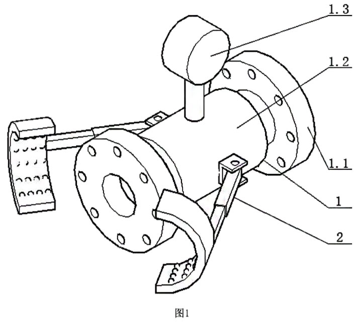需要說明的是,在不沖突的情況下,本申請中的實(shí)施例及實(shí)施例中的特征可以相互組合。下面將參考附圖并結(jié)合實(shí)施例來詳細(xì)說明本申請。如圖1所示,一種便于安裝的電磁流量計(jì),包括電磁流量計(jì)主體1,所述電磁流量計(jì)主體1包括法蘭盤1.1、測量導(dǎo)管1.2和轉(zhuǎn)換器1.3,所述測量導(dǎo)管1.2為水平橫向放置管道,所述轉(zhuǎn)換器1.3固定在所述測量導(dǎo)管1.2的上端面,兩個(gè)所述法蘭盤1.1分別位于所述測量導(dǎo)管1.2的左端面和右端面,還包括定位裝置2,兩個(gè)所述定位裝置2分別固定在所述測量導(dǎo)管1.2的前端面和后端面。所述定位裝置2主要用于所述電磁流量計(jì)主體1安裝時(shí)使用。