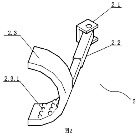 如圖2所示,所述定位裝置2包括U型連接組件2.1、可轉(zhuǎn)動伸縮桿2.2、夾持弧形件2.3,所述U型連接組件2.1固定在所述測量導(dǎo)管1.2上,所述可轉(zhuǎn)動伸縮桿2.2為長方形伸縮桿,所述可轉(zhuǎn)動伸縮桿2.2的右端部位通過銷軸與所述U型連接組件2.1鉸接,所述夾持弧形件2.3固定在所述可轉(zhuǎn)動伸縮桿2.2的左端面,所述夾持弧形件2.3上設(shè)有滾珠2.3.1,若干個(gè)所述滾珠2.3.1位于所述夾持弧形件2.3的內(nèi)側(cè)表面上,所述滾珠2.3.1可相對所述夾持弧形件2.3滾動。