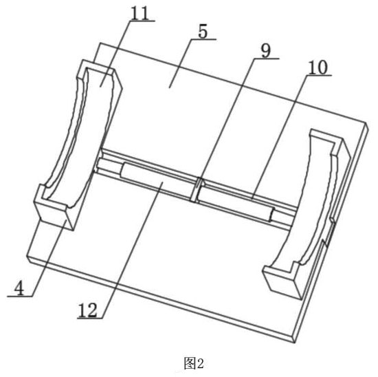如圖1-5所示,優(yōu)選的,清洗座5的頂部開(kāi)設(shè)有放置槽10,放置槽10的內(nèi)壁中部固定安裝有固定分隔板9,固定分隔板9的底部與放置槽10的內(nèi)壁底部相貼合,固定分隔板9外壁左右兩側(cè)面固定連接有電動(dòng)伸縮桿12,每個(gè)電動(dòng)伸縮桿12的伸縮端固定連接有支撐板4,每個(gè)支撐板4的頂部開(kāi)設(shè)有定位弧形槽11,電磁流量計(jì)本體6外壁兩端與貫穿槽8的內(nèi)壁相貼合,電動(dòng)伸縮桿12能夠?qū)χ伟?的位置進(jìn)行調(diào)整,進(jìn)而方便支撐板4對(duì)電磁流量計(jì)本體6進(jìn)行夾持,同時(shí)通過(guò)定位弧形槽11對(duì)電磁流量計(jì)本體6進(jìn)行固定,方便對(duì)電磁流量計(jì)本體6進(jìn)行清洗。
