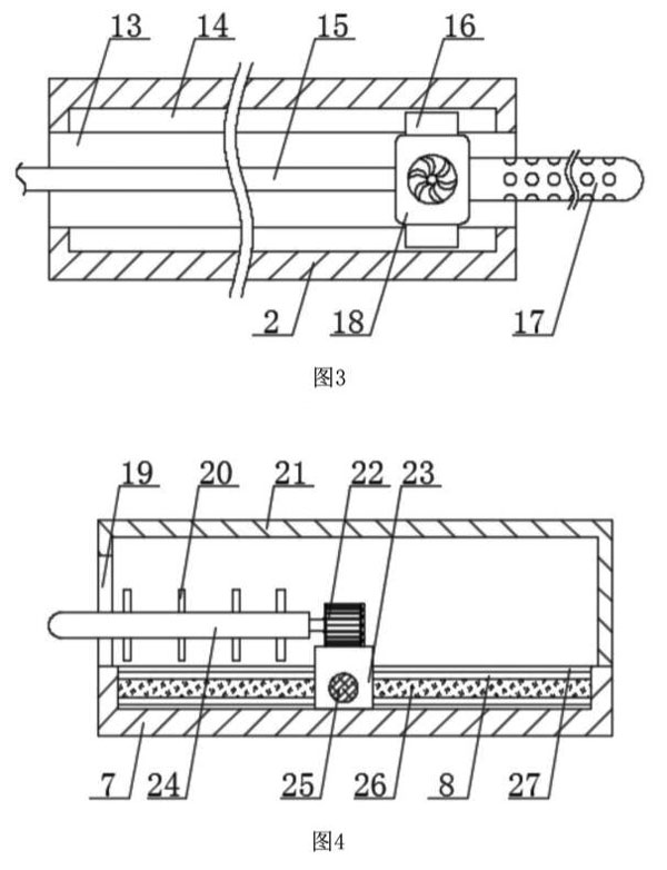 如圖1-5所示,在對(duì)電磁流量計(jì)本體6進(jìn)行清洗時(shí),通過(guò)電動(dòng)伸縮桿12推動(dòng)支撐板4向外移動(dòng),使電磁流量計(jì)本體6放置在定位弧形槽11上,使電動(dòng)伸縮桿12對(duì)支撐板4進(jìn)行收縮,從而更加快捷的對(duì)電磁流量計(jì)本體6進(jìn)行固定,同時(shí)定位弧形槽1l也能對(duì)電磁流量計(jì)本體6提供支撐,使電磁流量計(jì)本體6固定后進(jìn)行清洗,通過(guò)導(dǎo)向滑塊16方便對(duì)水泵18進(jìn)行滑動(dòng),使水泵18上的多孔清洗管17能夠移動(dòng)到電磁流量計(jì)本體6的內(nèi)部,對(duì)電磁流量計(jì)本體6內(nèi)部進(jìn)行噴水,使電磁流量計(jì)本體6內(nèi)部的水垢進(jìn)行掉落,而彈性輸水管15能夠便于水泵18在移動(dòng)后進(jìn)行供水,通過(guò)用手移動(dòng)推動(dòng)桿25,使安裝座23進(jìn)行移動(dòng),使U型清洗架24在電磁流量計(jì)本體6的內(nèi)部進(jìn)行來(lái)回移動(dòng),便于對(duì)電磁流量計(jì)本體6內(nèi)部清洗得更加徹底,從而通過(guò)啟動(dòng)驅(qū)動(dòng)電機(jī)22帶動(dòng)U型清洗架24進(jìn)行轉(zhuǎn)動(dòng),使U型清洗架24上的清理刷28對(duì)電磁流量計(jì)本體6內(nèi)部的水垢進(jìn)行清洗,而穩(wěn)固環(huán)20能夠避免U型清洗架24在清洗過(guò)程中出現(xiàn)損壞。