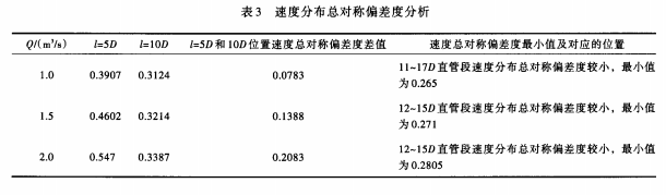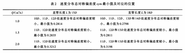 4.1.3 800mm內徑電磁流量計測量管路設計分析 根據上述計算結果統(tǒng)計出不同過流量、不同直管長度,速度分布總對稱偏差度的*小值及對應的位置,見表2。從表2可以看出,當直管長度L取12m和14.4m時,均有部分位置的速度分布總對稱偏差度較小,且兩種直管長度下總對稱偏差度*小值相差很小。以Q=2.0m3/s為例,L取12m和14.4m時,總對稱偏差度*小值分別為0.3212和0.3198,差值為,0.0014。由此可見,當測量直管長度達到一定值時,繼續(xù)延長測量直管長度并不能顯著改善管內速度的軸對稱分布情況。