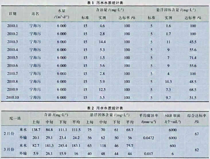 以一礦為例,2010年1~10月寧海污水站累計處理污水187萬m3,日均6200m3,1~10月份外輸污水含油累計達標率1 0 0%,外輸懸浮物累計達標率69.7%(見表1)。