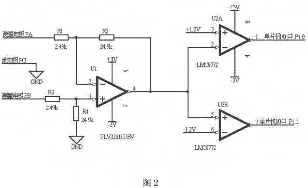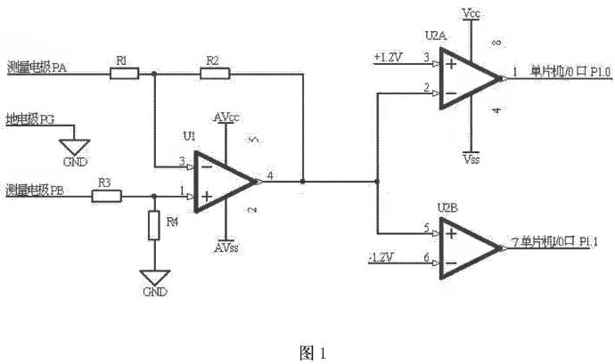 如圖1所示,應(yīng)用于電磁流量計(jì)極化電壓檢測(cè)的電路,測(cè)量電極PA與電阻R1的端連接,電阻R1的另一端與電阻R2的一端、運(yùn)算放大器U1的反相輸入端3腳連接,電阻R2的另一端與運(yùn)算放大器U1的輸出端4腳、雙路比較器通道一U2A的反相輸入端2腳、雙路比較器通道二U2B的同相輸入端5腳連接,測(cè)量電極PB與電阻R3的一端連接,電阻R3的另一端與電阻R4的一端、運(yùn)算放大器U1的同相輸入端1腳連接,電阻R4的另一端與地連接,地電極PG與地連接,運(yùn)算放大器U1的電源供電端5腳與正電源VAcc連接,運(yùn)算放大器U1的接地端2腳與負(fù)電源WAss連接,雙路比較器通道一U2A的同相輸入端3腳與+1.2V連接,雙路比較器U2A的電源供電端8腳與正電源VAcc連接,雙路比較器U2A的接地端4腳與負(fù)電源wAss連接,雙路比較器通道一U2A的輸出端1腳與單片機(jī)的I/O口P1.0連接,雙路比較器通道二U2B的反相輸入端6腳與-1.2V連接,雙路比較器通道二U2B的輸出端7腳與單片機(jī)的I/O口P1.1連接如圖2所示,測(cè)量電極PA與電阻Rl的一端連接,電阻R1的另一端與電阻R2的端、運(yùn)算放大器U1的反相輸入端3腳連接,電阻R2的另一端與運(yùn)算放大器U1的輸出端4腳、雙路比較器通道一U2A的反相輸入端2腳、雙路比較器通道二U2B的同相輸入端5腳連接,測(cè)量電極PB與電阻R3的一端連接,電阻R3的另一端與電阻R4的一端、運(yùn)算放大器UI的同相輸入端1腳連接,電阻R4的另一端與地連接,地電極PG與地連接,運(yùn)算放大器U的電源供電端5腳與正電源+3連接,運(yùn)算放大器UI的接地端2腳與負(fù)電源-3V連接,雙路比較器通道一U2A的同相輸入端3腳與+1.2V連接,雙路比較器U2A的電源供電端8腳與正電源+3V連接,雙路比較器U2A的接地端4腳與負(fù)電源-3V連接,雙路比較器通道U2A的輸出端1腳與單片機(jī)的I0口P1.0連接,雙路比較器通道二U2B的反相輸入端6腳與-1.V連接,雙路比較器通道二U2B的輸出端7腳與單片機(jī)的I/0口P1.1連接。