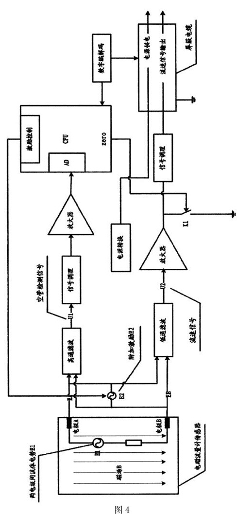 見圖1示意圖中,電磁流量計(jì)傳感器在交流勵磁下,產(chǎn)生交變磁場,導(dǎo)電流體在交變磁場中切割磁力線產(chǎn)生感應(yīng)電勢E1,通過屏蔽電纜輸出至遠(yuǎn)端信號轉(zhuǎn)換器的主控制電路板,在主控制電路板上輸出流速信號并顯示見圖3、圖4示意圖中,由CPU控制口產(chǎn)生周期為l6us的高頻激勵,經(jīng)模擬轉(zhuǎn)換為高頻正弦激勵E2,該正弦激勵直接施加在,電磁流量計(jì)傳感器的其中一個電極與地或者是兩個電極之間,(圖3是一個電極與地之間施加空管檢測信號的電磁流量計(jì)的電路結(jié)構(gòu)圖,圖4是兩個電極之間施加空管檢測信號的電磁流量計(jì)的電路結(jié)構(gòu)圖);由此產(chǎn)生被測流體內(nèi)阻Rl的測量信號U1,該測量信號U1與流體內(nèi)阻R1成線性關(guān)系U1=K*R1(K為已知系數(shù))。不可避免的是流體內(nèi)阻測量信號與流體流速測量信號同時存在,二者混在一起,再經(jīng)過高通濾波電路將空管檢測信號提取岀來,此時對流速信號衰減在60dB以上,經(jīng)CPU實(shí)時采樣并經(jīng)過數(shù)字濾波后,與設(shè)定的閾值(可調(diào)參數(shù))相比較,若判斷為空管,則CPU發(fā)出zero信號,立刻閉合開關(guān)K1關(guān)閉流速測量信號,使信號轉(zhuǎn)換器顯示為零,否則斷開開關(guān)KI正常輸出流速信號。而電極上流速測量信號經(jīng)過低通濾波電路,此時對空管檢測信號衰減60B以上,再經(jīng)過信號調(diào)理電路后輸出流速信號,實(shí)現(xiàn)與空管檢測信號相互分離,從而保證流速測量的準(zhǔn)確度。