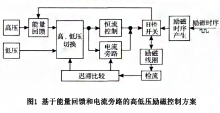 基于能量回饋和電流旁路的高低壓勵(lì)磁控制方案框圖如圖 1 所示, 主要由高低壓電源、能量回饋電路、高低壓切換電路、便流控制電路、電流旁路電路、互橋開(kāi)關(guān)電路、檢流電路和勵(lì)磁時(shí)序產(chǎn)生電路組成。