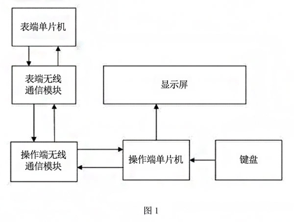 以下結(jié)合附圖說(shuō)明對(duì)本用于電磁流量計(jì)的無(wú)線手操器的實(shí)施例作進(jìn)一步詳細(xì)描述,如圖1所示,本實(shí)用新型實(shí)施例所提供的一種用于電磁流量計(jì)的無(wú)線手操器,所述電磁流量計(jì)內(nèi)置有表端單片機(jī)和表端無(wú)線通信模塊,所述表端單片機(jī)設(shè)有通信接口,其特征在于:該手操器包括鍵盤、顯示屏、操作端單片機(jī)、操作端無(wú)線通信模塊;