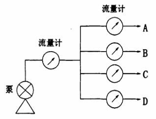 因加工不合格水煤漿的顆粒較大容易堵塞噴槍,小鍋爐大部分采用一臺(tái)“螺桿泵”加壓帶一只噴槍,用壓力或流量檢測(cè)噴槍堵塞都好解決。但大鍋爐用8~12只噴槍,如圖所示,若A槍半堵塞時(shí),因B、C、D槍在繼續(xù)噴射,壓力變送器則檢測(cè)不到A槍是否在正常工作,在此情況下易造成爐膛燃燒點(diǎn)不均勻,影響鍋爐的正常工作。若A槍全堵塞,因B、C、D槍在繼續(xù)噴射,所以A槍壓力的突然變化量很小(壓力信號(hào)本身也存在上下的微小波動(dòng)),DCS很難做出準(zhǔn)確判斷,故用壓力變送器很難達(dá)到預(yù)想的效果。若用流量計(jì)檢測(cè),流量計(jì)輸出信號(hào)送到DCS,利用其編程可以完全檢測(cè)到噴槍堵塞狀況并報(bào)警提示,以便及時(shí)清洗噴嘴。